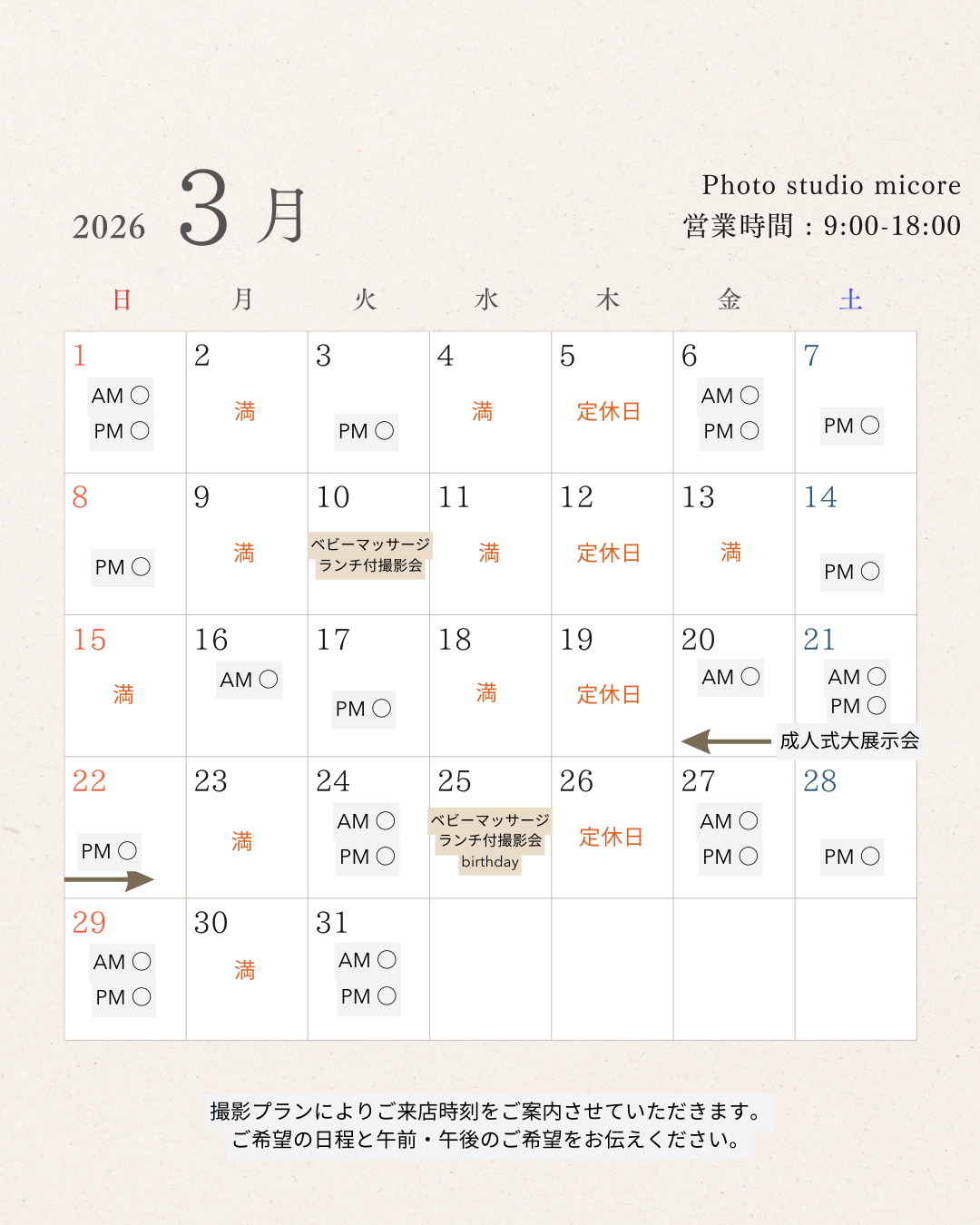 撮影プランに応じてご来店時間をご案内させていただきますので