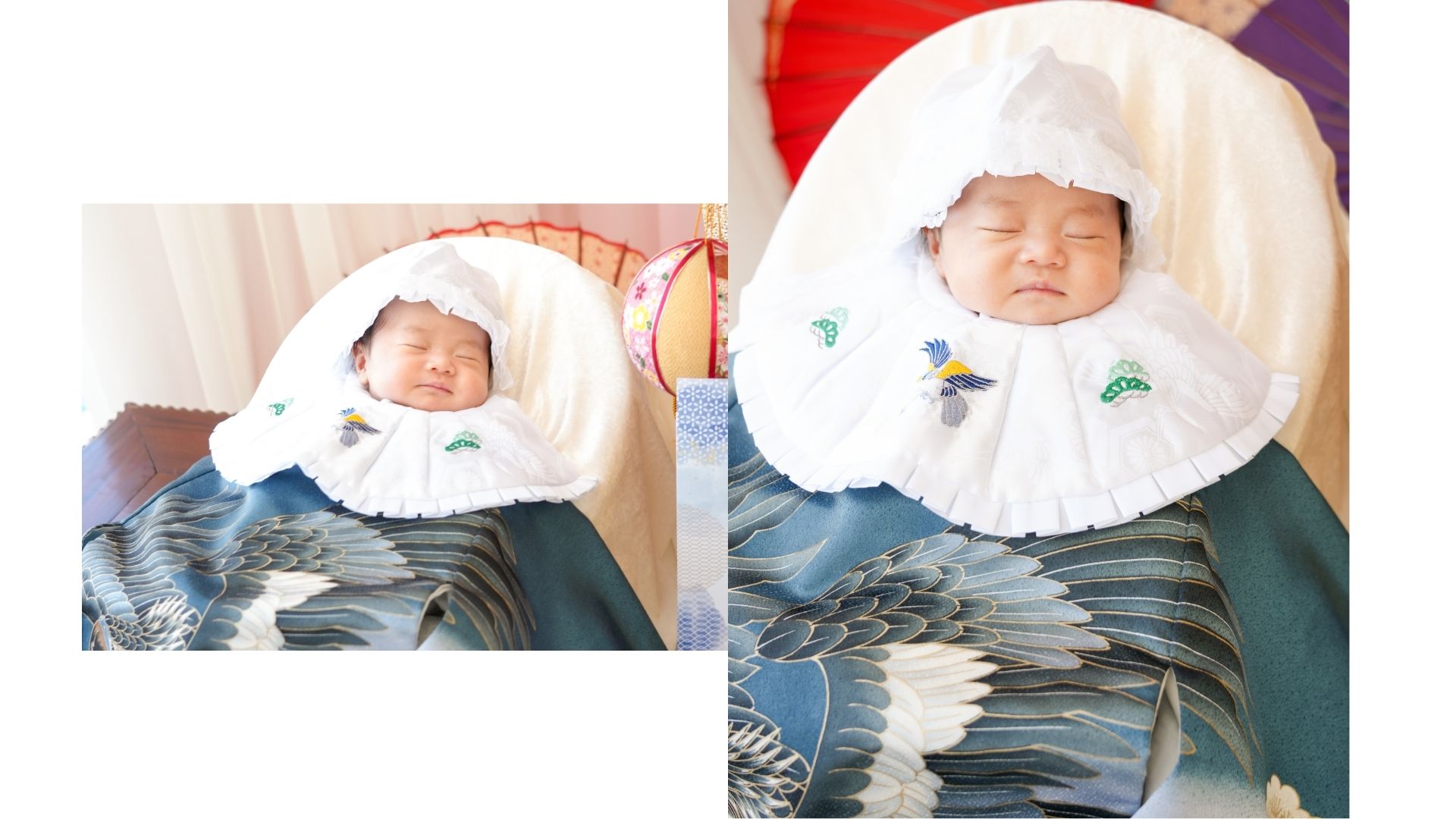 祝い着や帽子・スタイを付けてもぐっすりでした(*´艸`*)